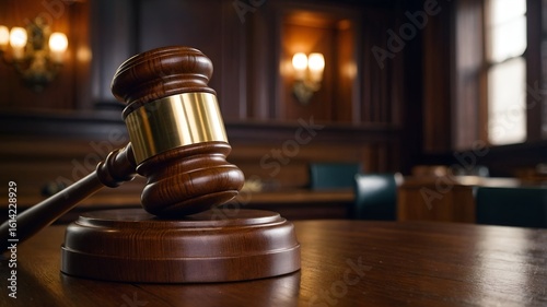Wooden gavel on table symbolizing justice, law, and legal authority in courtroom.