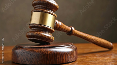 Wooden gavel resting on a circular base symbolizes justice in a courtroom setting
