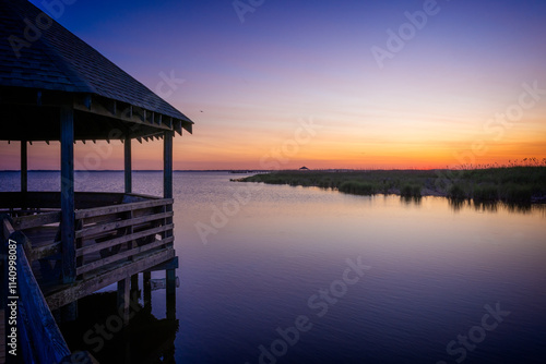 Wooden Gazebo line the coastline of Corolla in Outerbanks at sunset