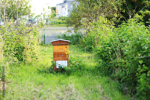 wooden hive of honeybees located on green meadow against trees on summer day