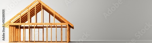 Wooden house builder with rural construction concept. A wooden house frame stands against a plain background, showcasing architectural design and construction elements.