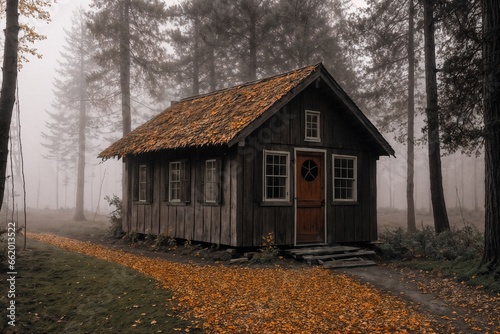wooden house in a forest, autumn nature as background, overcast, trees and fog