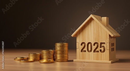 Wooden house model and coins stack budget home new year concept, Wooden house model with text 2025 on a table, Real estate new year concept