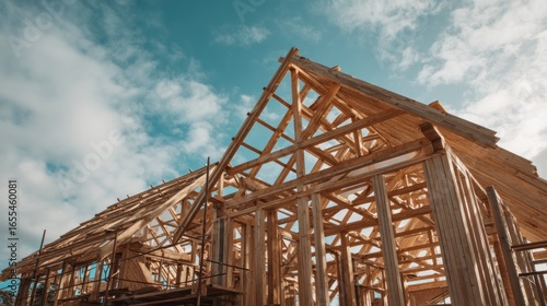 construction, house, wooden, framing, roof, building, wood, structure, building site, scaffolding, home, roofing, beam, support, framework, residential, building material, progress, sunlight, cloudy, sky, daylight, outdoors, exterior, construction site, architecture, design, house-building, construction worker, building material, residential construction