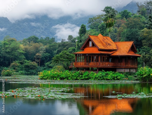 house, lake, wooden, orange, roof, green, vegetation, mountain, water, tree, forest, nature, landscape, serene, calm, peaceful, tranquil, building, architecture, plant, lily, pad, cloud, sky, environment, scenic, rural, remote, quiet, retreat, habitat, duck pond, home, estate, bungalow, filed, cabin, travel, destination