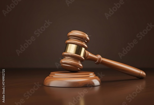 Wooden judge gavel with brass band resting on wooden surface and brown background