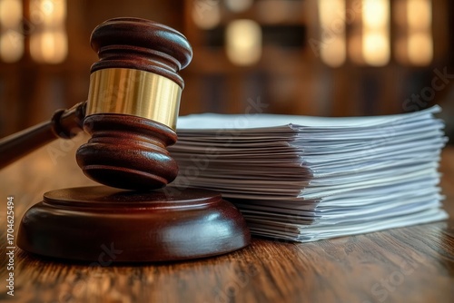 wooden judge gavel with stack of paper documents on wooden table under warm lighting