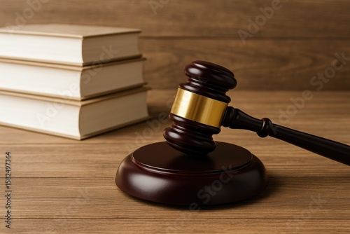 Wooden judge's hammer resting beside books on a wooden surface