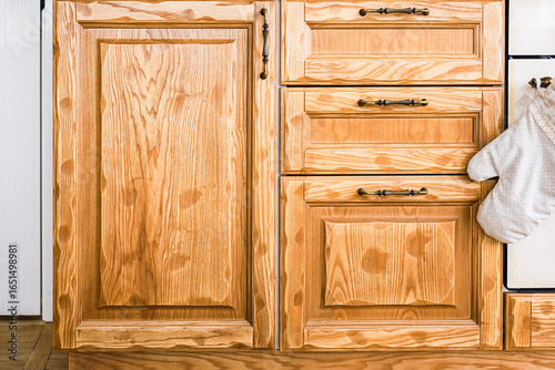 Wooden kitchen cabinets with natural finish and decorative handles in cozy home setting