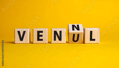 Wooden letter blocks spelling VENUL on a yellow background