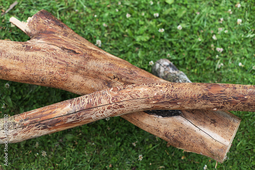 wooden log damaged by bark beerle . felled tree