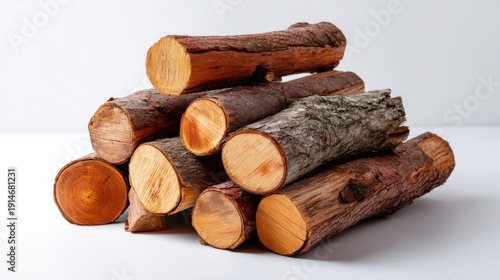 Wooden logs of pine firewood stacked neatly on white background, showcasing their rustic charm for home fireplace design