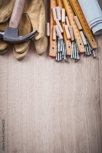 Wooden meter dowels blueprints hammer pair of protective gloves