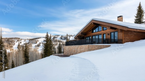 Wooden mountain lodge, snow-covered slopes, winter ski resort landscape, modern cabin architecture, panoramic windows, luxury real estate, mountain views