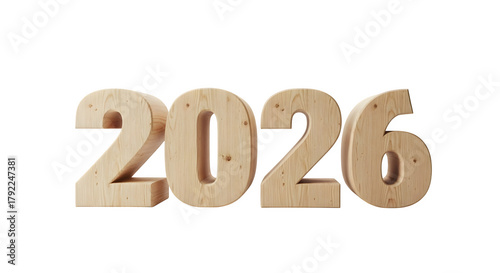 Wooden numbers 2026 isolated on transparent background, representing the upcoming year