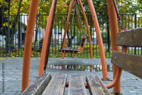 Wooden orange swing on the background of autumn landscape