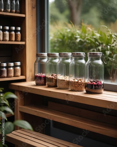 Wooden pantry shelves organized with jars of seeds, nuts, and spices, warmly lit by natural sunlight. Ideal for content related to home organization, sustainable living, or rustic kitchen design