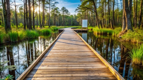 forest, path, wooden, boardwalk, tree, wetland, water, duck pond, swamp, nature, landscape, outdoors, travel, vacation, summer, green, blue skies, sunshine, bright, light, peaceful, tranquil, serene, scenic, beautiful, calm, relaxing, inspiration, journey, pathway, wood, trail, paseo, walk, hiking, adventure, signs, blank, empty, advertising, template, promotional, design, graphic, illustration, image, photo