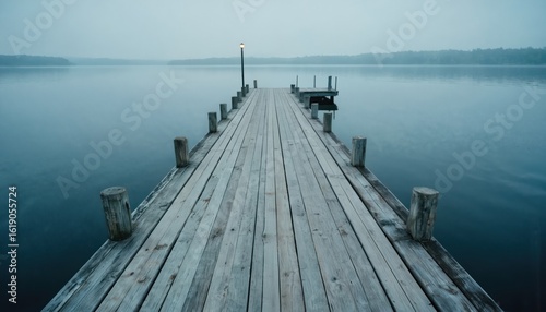 Wooden pier extends over calm lake water. Reflective surface mirrors misty sky and distant tree line. Gray planks, weathered wood, nautical theme. Peaceful, serene atmosphere for relaxation, vacation.