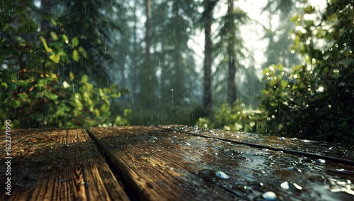 rain, forest, wood, wet, plank, table, raindrop, green, tree, nature, misty, sunlight, dense, outdoors, fresh, damp, lush, wood, landscape, ambience, foggy, cool, evening, morning, tranquil, calm, peaceful, rustic, old, brown, water droplets, detail, closeup, texture, wood grain, natural, environment, detailed, digital, realistic, exterior, scenic, atmosphere, rainforest, pine