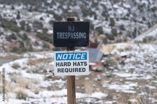 now, no trespassing, signs, construction, restricted, rugged, landscape, winter, cold, wooden, post, safety, regulation, notice, caution, hill, cloudy, sparse, vegetation, remote, weathered, environment, stark, industrial, mandatory, workplace, terrain, frost, chill, isolation, protocol, marker, zone, operation, security, access, control, boundary, snow, symbol, signpost, nature, direction