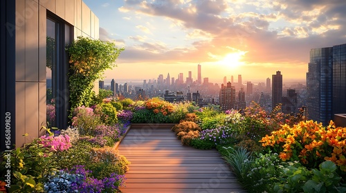 rooftop, garden, flower, city landscape, sunrise, city view, urban, floral, vibrant, landscape, building, architecture, skyline, blossom, bloom, residential, scenic, sunny, daybreak, sunlight, luxury, paseo, path, terrace, housing, apartment, home, real estate, travel, vacation, plant, foliage, greenery, nature, elevation, highrise, condominium, property, estate, residence, habitat
