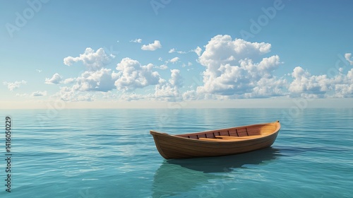 Wooden Rowboat on Calm Ocean Water under Blue Sky with Fluffy Clouds Peaceful Summer Day Sea Azure