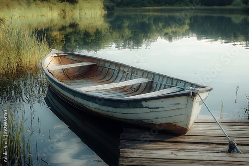 Wooden Rowboat Tied to a Dock on a Calm Lake - Realistic Image