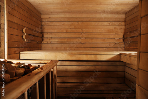 Wooden sauna with bench and hot stones