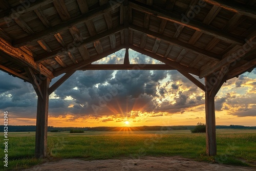 Wooden shelter frame showcasing a vibrant sunset over a grassy plain.