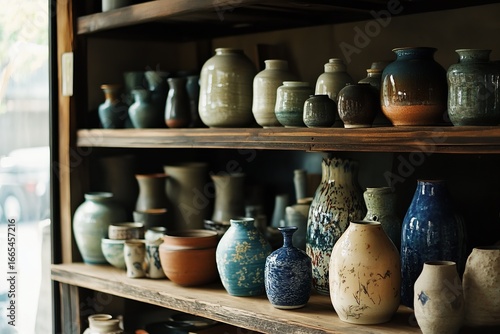 shelf, vase, pot, ceramic, wooden, clay, decor, craft, pottery, art, hand-made, colours, muted, rustic, collection, display, home, interior, design, elegant, vintage, studio, artisan, object, detail, arrangement, storage, shelving, glazed, colours, natural, light, gallery, style, art