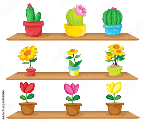 illustration, drawing, graphic, image, isolated, white, background, wooden, shelf, shelf, plant, ornamental, ornament, colourful, pot, yellow, orange, blue, brown, red, green, pink, cactus, flower, leaf, dirtied, fertile, healthy, decoration, adornment, pic, cartoon, clip art, clip art, clip art, cactus, cactus, garden, potted, pot, vector
