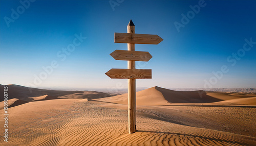 wooden signpost in the desert rustic wooden signpost with three blank directional arrows stands tall against the backdrop of rolling sand dunes pointing the way under a bright blue sky