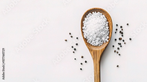 Wooden Spoon Filled with Sea Salt Isolated on White Background with Black Peppercorns Adding Texture and Contrast for Culinary Presentations and Food Photography
