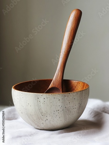 Wooden Spoon Resting in a Textured Ceramic Bowl on White Linen, a Still Life Capturing Simple Beauty and Minimalist Design for Home Decor and Culinary Aesthetics