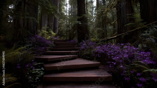 Wooden staircase winding through a forest garden filled with purple flowers.