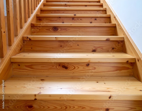 Wooden stairs ascending in bright interior showcasing natural grain. Ideal for architectural photography and home design content