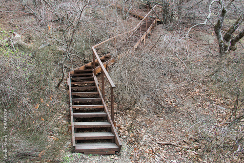 wooden stairs in the park in autumn