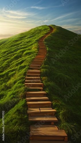 Wooden Stairway Leading to Summit of Lush Green Hill Under a Bright Blue Sky with Whispy Clouds