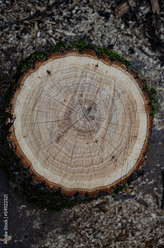 Wooden stump. Wood texture. Sawn tree with annual rings.
