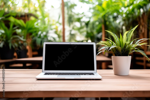 Wooden table featuring a laptop with a white empty screen, accompanied by a cup of coffee, enhanced by the vibrant backdrop of a blurred potted plant.