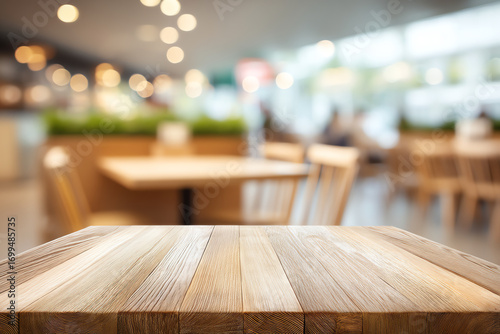 Wooden table surface in a bright, blurred cafe interior with warm lighting and modern furniture, creating a cozy and inviting atmosphere
