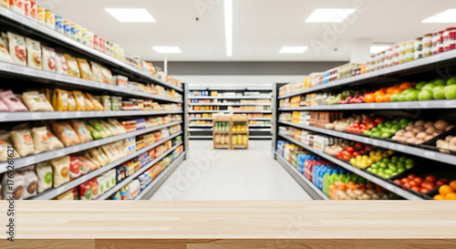 supermarket, food market, table, wood, background, blurred, aisle, shelf, food, product, retail, store, display, empty, top, shop, shopping, market, indoor, consumerism, business, wooden, grocery, merchandise, nourishment, variety, arrangement, convenience, selection, healthy, fresh, marketplace, space, perspective, lifestyle, commercial, nobody, closeup, macro, studio shot, white, illuminated, interior, contemporary, modern, copy space