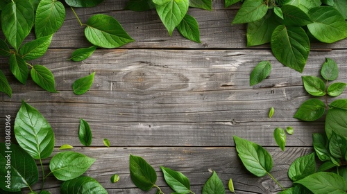 wooden table top with spring green leafs as frame and free space for text AI generated