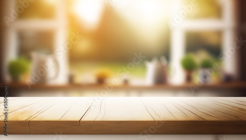 Wooden table with a defocused kitchen room. For montage product display. Copy space. Generative ai..