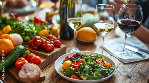 Wooden table with a farm-to-table dinner of fresh produce and wine, organic meal, natural evening enjoyment