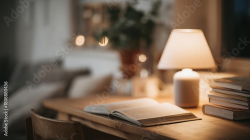 wooden, table, book, open, book, white, lamp, beige, shade, background, blurred, living, room, couch, potted, plant, dimly, lit, creating, cosy, atmosphere, mood, peaceful, relaxed, relaxation, craftsmanship
