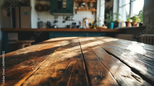 Wooden table with no items, with a kitchen backdrop, perfect for showcasing products.