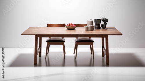 wooden table, table, chair, still life, photo, studio, white background, minimalist, modern, contemporary, interior design, home decor, dining room, kitchen, living room, furniture, wood, brown, white, light, shadow, clean, simple, empty, space