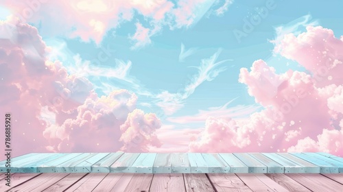 wooden terrace with beautiful view blue sky and pink cloud, copy space for display of product or object presentation and advertisement concept